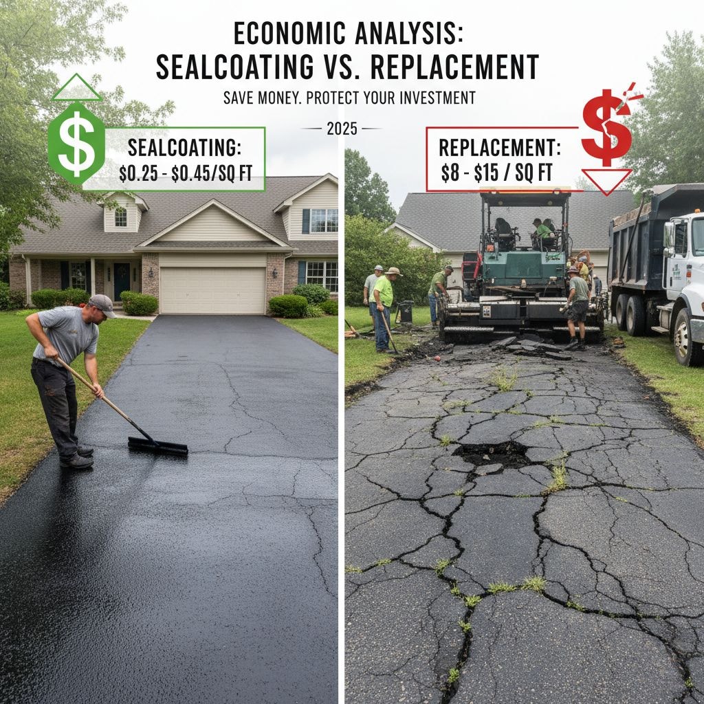 Sealcoating is quicker, more affordable, and ideal for extending lifespan. Replacement requires more time and investment but resets the life of your driveway entirely.